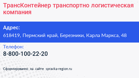 ТрансКонтейнер, транспортно-логистическая компания по адресу 618419, Пермский край, Березники, Карла Маркса, 48 в дальнейшем Организация, размещена в следующих категориях: