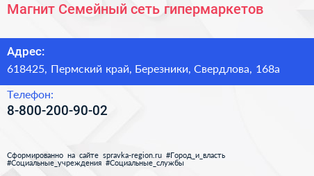 Магнит Семейный, сеть гипермаркетов по адресу 618425, Пермский край, Березники, Свердлова, 168а в дальнейшем Организация, размещена в следующих категориях: