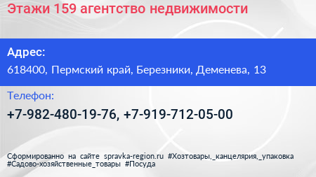 Этажи 159, агентство недвижимости по адресу 618400, Пермский край, Березники, Деменева, 13 в дальнейшем Организация, размещена в следующих категориях: