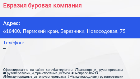 Евразия, буровая компания по адресу 618400, Пермский край, Березники, Новосодовая, 75 в дальнейшем Организация, размещена в следующих категориях: