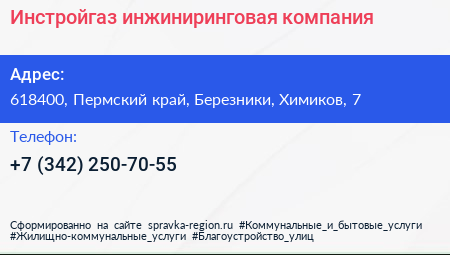 Инстройгаз, инжиниринговая компания по адресу 618400, Пермский край, Березники, Химиков, 7 в дальнейшем Организация, размещена в следующих категориях:
