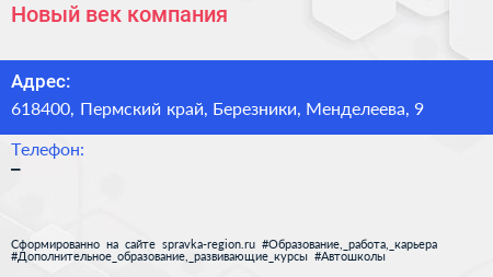 Новый век, компания по адресу 618400, Пермский край, Березники, Менделеева, 9 в дальнейшем Организация, размещена в следующих категориях: