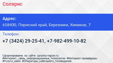 Солярис по адресу 618400, Пермский край, Березники, Химиков, 7 в дальнейшем Организация, размещена в следующих категориях: