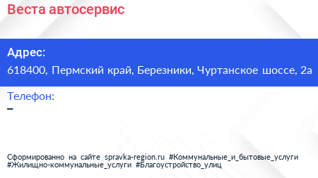 Веста, автосервис по адресу 618400, Пермский край, Березники, Чуртанское шоссе, 2а в дальнейшем Организация, размещена в следующих категориях: