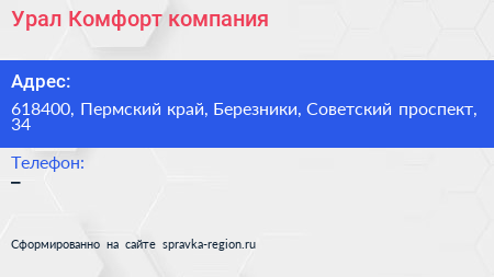 Урал Комфорт, компания по адресу 618400, Пермский край, Березники, Советский проспект, 34 в дальнейшем Организация, размещена в следующих категориях: