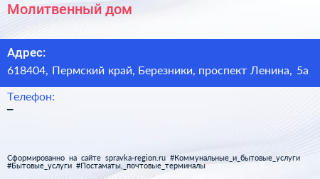 Молитвенный дом по адресу 618404, Пермский край, Березники, проспект Ленина, 5а в дальнейшем Организация, размещена в следующих категориях: