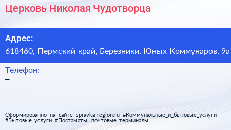 Церковь Николая Чудотворца по адресу 618460, Пермский край, Березники, Юных Коммунаров, 9а в дальнейшем Организация, размещена в следующих категориях: