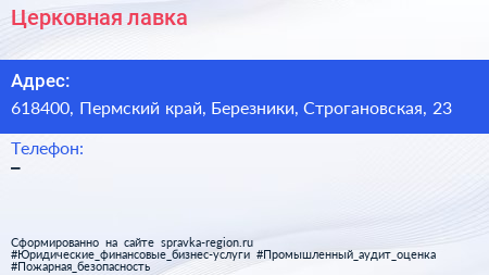 Церковная лавка по адресу 618400, Пермский край, Березники, Строгановская, 23 в дальнейшем Организация, размещена в следующих категориях:
