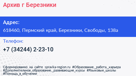 Архив г. Березники по адресу 618460, Пермский край, Березники, Свободы, 138а в дальнейшем Организация, размещена в следующих категориях: