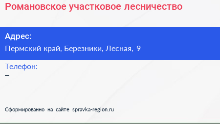 Романовское участковое лесничество по адресу Пермский край, Березники, Лесная, 9 в дальнейшем Организация, размещена в следующих категориях: