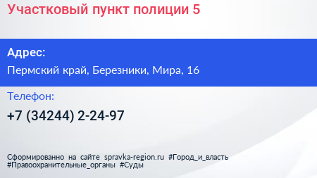 Участковый пункт полиции №5 по адресу Пермский край, Березники, Мира, 16 в дальнейшем Организация, размещена в следующих категориях:
