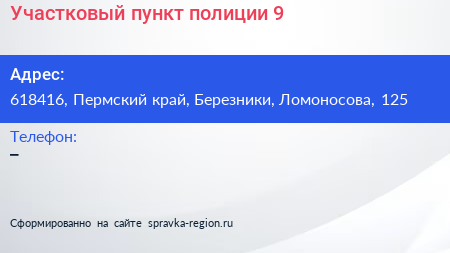 Участковый пункт полиции №9 по адресу 618416, Пермский край, Березники, Ломоносова, 125 в дальнейшем Организация, размещена в следующих категориях: