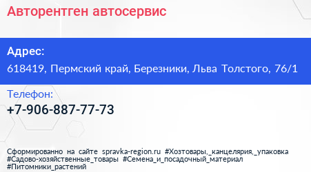 Авторентген, автосервис по адресу 618419, Пермский край, Березники, Льва Толстого, 76/1 в дальнейшем Организация, размещена в следующих категориях: