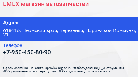 EMEX, магазин автозапчастей по адресу 618416, Пермский край, Березники, Парижской Коммуны, 21 в дальнейшем Организация, размещена в следующих категориях: