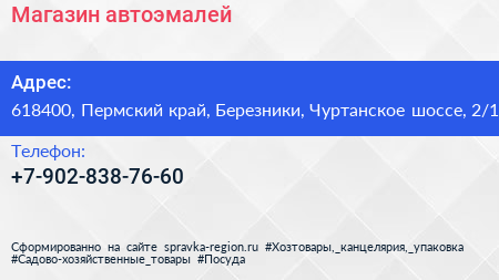 Магазин автоэмалей по адресу 618400, Пермский край, Березники, Чуртанское шоссе, 2/1 в дальнейшем Организация, размещена в следующих категориях: