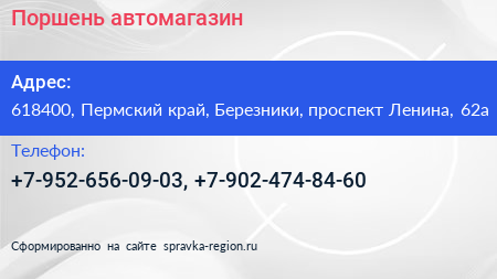 Поршень, автомагазин по адресу 618400, Пермский край, Березники, проспект Ленина, 62а в дальнейшем Организация, размещена в следующих категориях:
