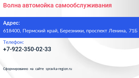 Волна, автомойка самообслуживания по адресу 618400, Пермский край, Березники, проспект Ленина, 71Б в дальнейшем Организация, размещена в следующих категориях: