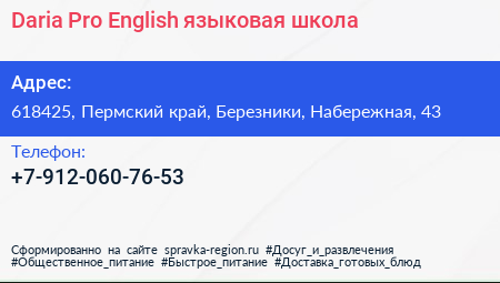 Daria Pro English, языковая школа по адресу 618425, Пермский край, Березники, Набережная, 43 в дальнейшем Организация, размещена в следующих категориях:
