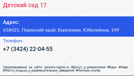 Детский сад №17 по адресу 618425, Пермский край, Березники, Юбилейная, 149 в дальнейшем Организация, размещена в следующих категориях:
