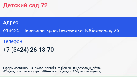 Детский сад №72 по адресу 618425, Пермский край, Березники, Юбилейная, 96 в дальнейшем Организация, размещена в следующих категориях: