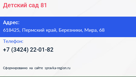 Детский сад №81 по адресу 618425, Пермский край, Березники, Мира, 68 в дальнейшем Организация, размещена в следующих категориях: