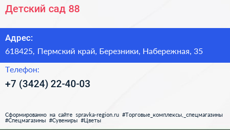 Детский сад №88 по адресу 618425, Пермский край, Березники, Набережная, 35 в дальнейшем Организация, размещена в следующих категориях: