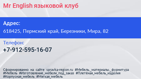 Mr.English, языковой клуб по адресу 618425, Пермский край, Березники, Мира, 82 в дальнейшем Организация, размещена в следующих категориях: