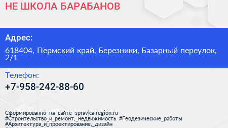 НЕ ШКОЛА БАРАБАНОВ по адресу 618404, Пермский край, Березники, Базарный переулок, 2/1 в дальнейшем Организация, размещена в следующих категориях: