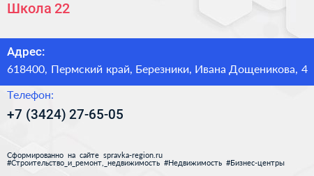 Школа №22 по адресу 618400, Пермский край, Березники, Ивана Дощеникова, 4 в дальнейшем Организация, размещена в следующих категориях: