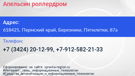 Апельсин, роллердром по адресу 618425, Пермский край, Березники, Пятилетки, 87а в дальнейшем Организация, размещена в следующих категориях: