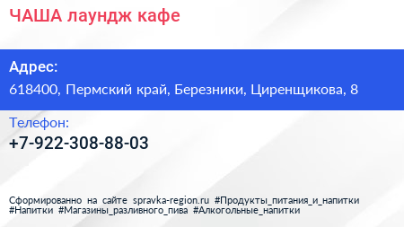ЧАША, лаундж-кафе по адресу 618400, Пермский край, Березники, Циренщикова, 8 в дальнейшем Организация, размещена в следующих категориях: