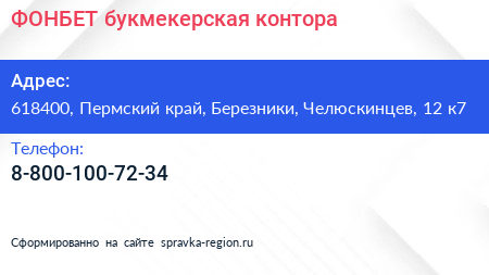 ФОНБЕТ, букмекерская контора по адресу 618400, Пермский край, Березники, Челюскинцев, 12 к7 в дальнейшем Организация, размещена в следующих категориях: