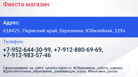 Фиеста, магазин по адресу 618425, Пермский край, Березники, Юбилейная, 129а в дальнейшем Организация, размещена в следующих категориях: