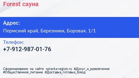 Forest, сауна по адресу Пермский край, Березники, Боровая, 1/1 в дальнейшем Организация, размещена в следующих категориях: