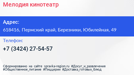 Мелодия, кинотеатр по адресу 618416, Пермский край, Березники, Юбилейная, 49 в дальнейшем Организация, размещена в следующих категориях: