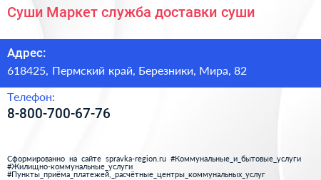 Суши-Маркет, служба доставки суши по адресу 618425, Пермский край, Березники, Мира, 82 в дальнейшем Организация, размещена в следующих категориях: