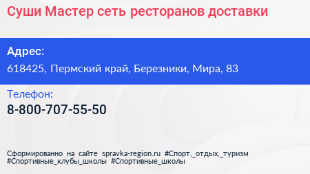 Суши Мастер, сеть ресторанов доставки по адресу 618425, Пермский край, Березники, Мира, 83 в дальнейшем Организация, размещена в следующих категориях: