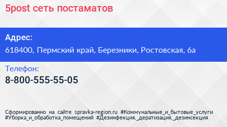 5post, сеть постаматов по адресу 618400, Пермский край, Березники, Ростовская, 6а в дальнейшем Организация, размещена в следующих категориях: