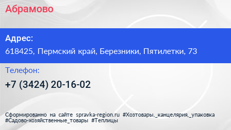 Абрамово по адресу 618425, Пермский край, Березники, Пятилетки, 73 в дальнейшем Организация, размещена в следующих категориях: