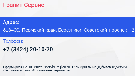 Гранит-Сервис по адресу 618400, Пермский край, Березники, Советский проспект, 2г в дальнейшем Организация, размещена в следующих категориях: