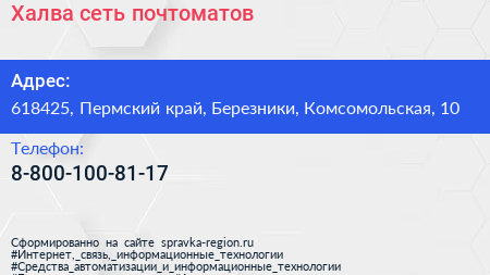 Халва, сеть почтоматов по адресу 618425, Пермский край, Березники, Комсомольская, 10 в дальнейшем Организация, размещена в следующих категориях: