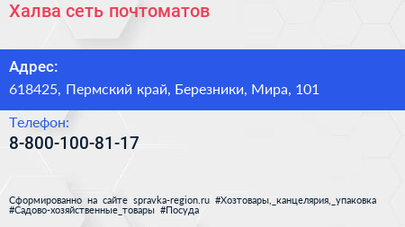 Халва, сеть почтоматов по адресу 618425, Пермский край, Березники, Мира, 101 в дальнейшем Организация, размещена в следующих категориях: