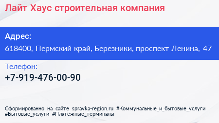 Лайт-Хаус, строительная компания по адресу 618400, Пермский край, Березники, проспект Ленина, 47 в дальнейшем Организация, размещена в следующих категориях: