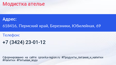 Модистка, ателье по адресу 618416, Пермский край, Березники, Юбилейная, 69 в дальнейшем Организация, размещена в следующих категориях: