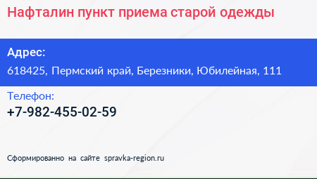 Нафталин, пункт приема старой одежды по адресу 618425, Пермский край, Березники, Юбилейная, 111 в дальнейшем Организация, размещена в следующих категориях: