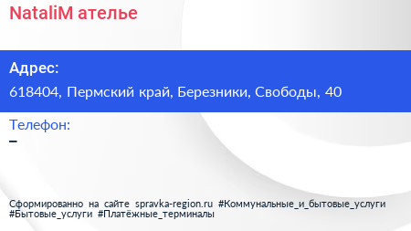 NataliM, ателье по адресу 618404, Пермский край, Березники, Свободы, 40 в дальнейшем Организация, размещена в следующих категориях:
