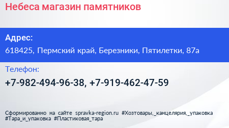 Небеса, магазин памятников по адресу 618425, Пермский край, Березники, Пятилетки, 87а в дальнейшем Организация, размещена в следующих категориях: