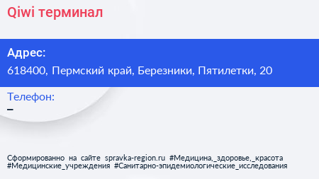 Qiwi, терминал по адресу 618400, Пермский край, Березники, Пятилетки, 20 в дальнейшем Организация, размещена в следующих категориях: