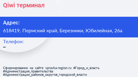 Qiwi, терминал по адресу 618419, Пермский край, Березники, Юбилейная, 26а в дальнейшем Организация, размещена в следующих категориях: