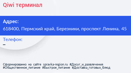 Qiwi, терминал по адресу 618400, Пермский край, Березники, проспект Ленина, 45 в дальнейшем Организация, размещена в следующих категориях: